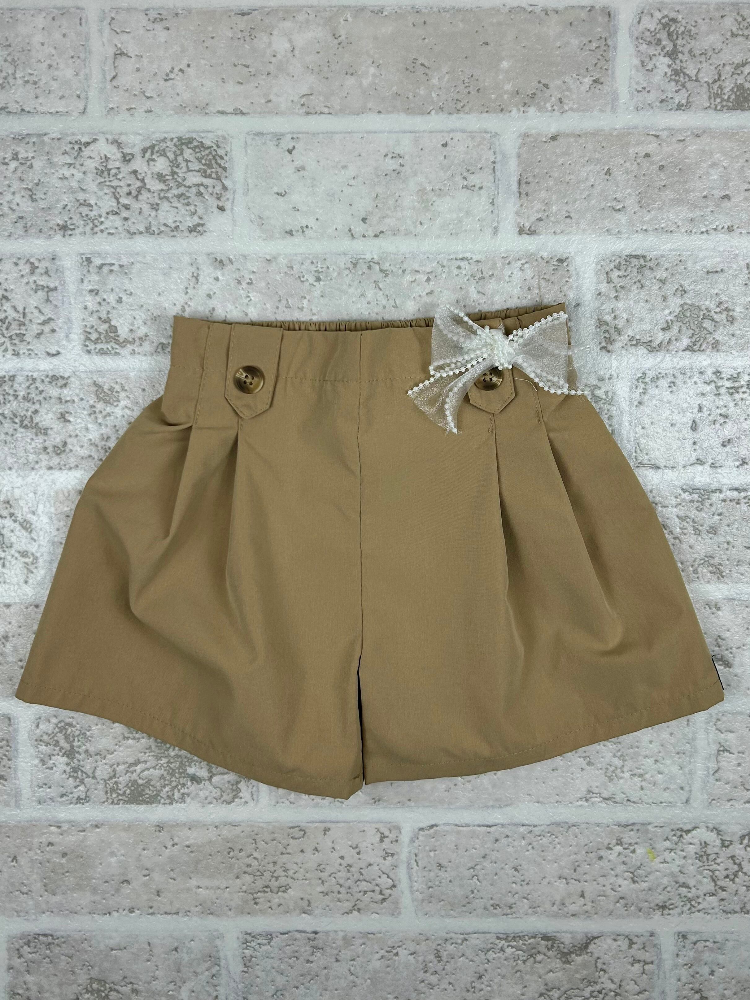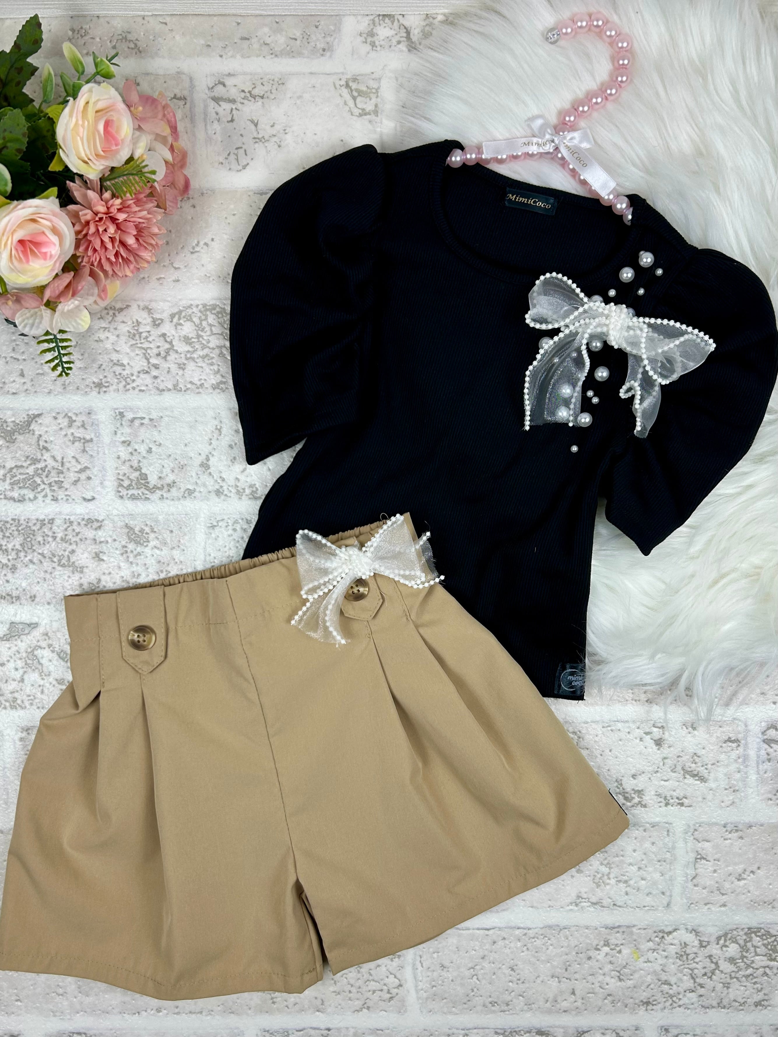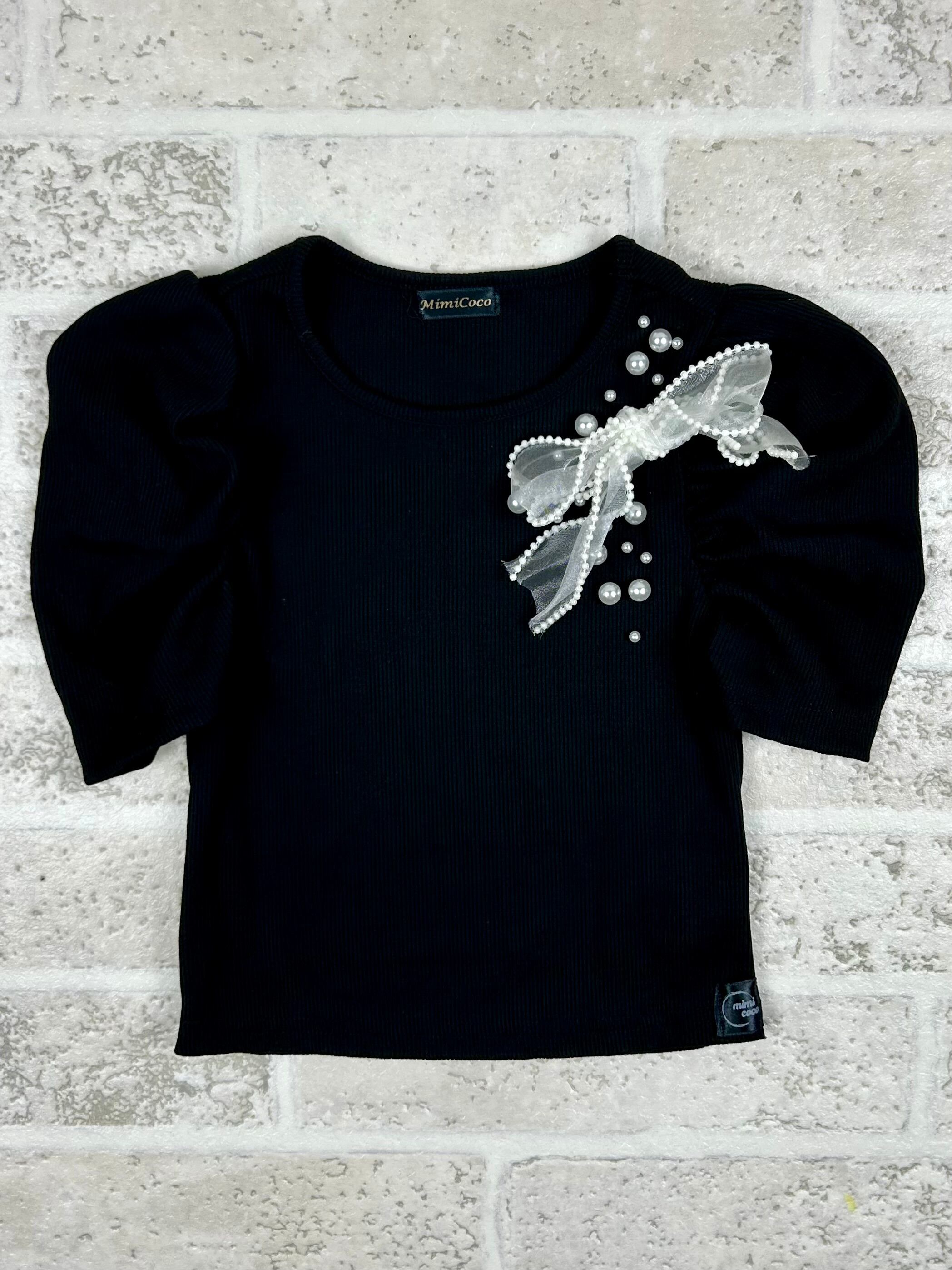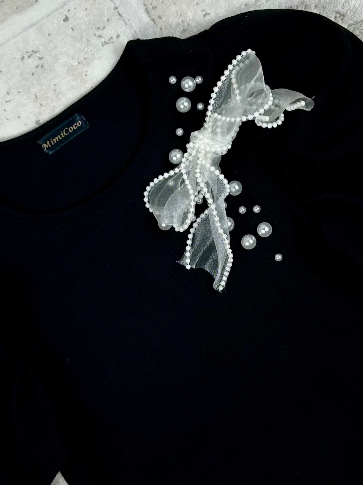 華やかなパールと可愛らしいリボンデザインが特徴的なこのセットアップは、カジュアルシーンから特別な日まで幅広く活躍するアイテムです。柔らかく快適な素材を使用しており、心地よい着心地を提供します。シンプルながらもリボン付きのトップスとキュロットパンツが女の子らしさを引き立てるデザインが魅力です。