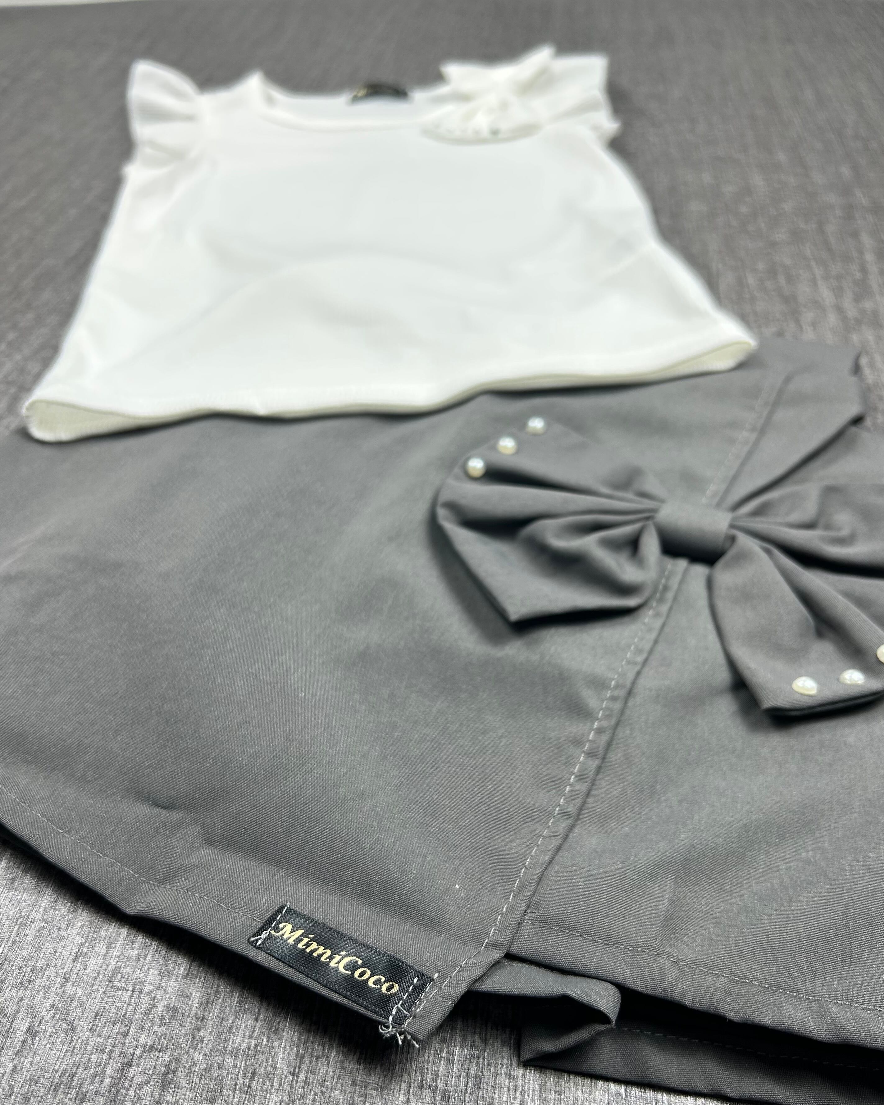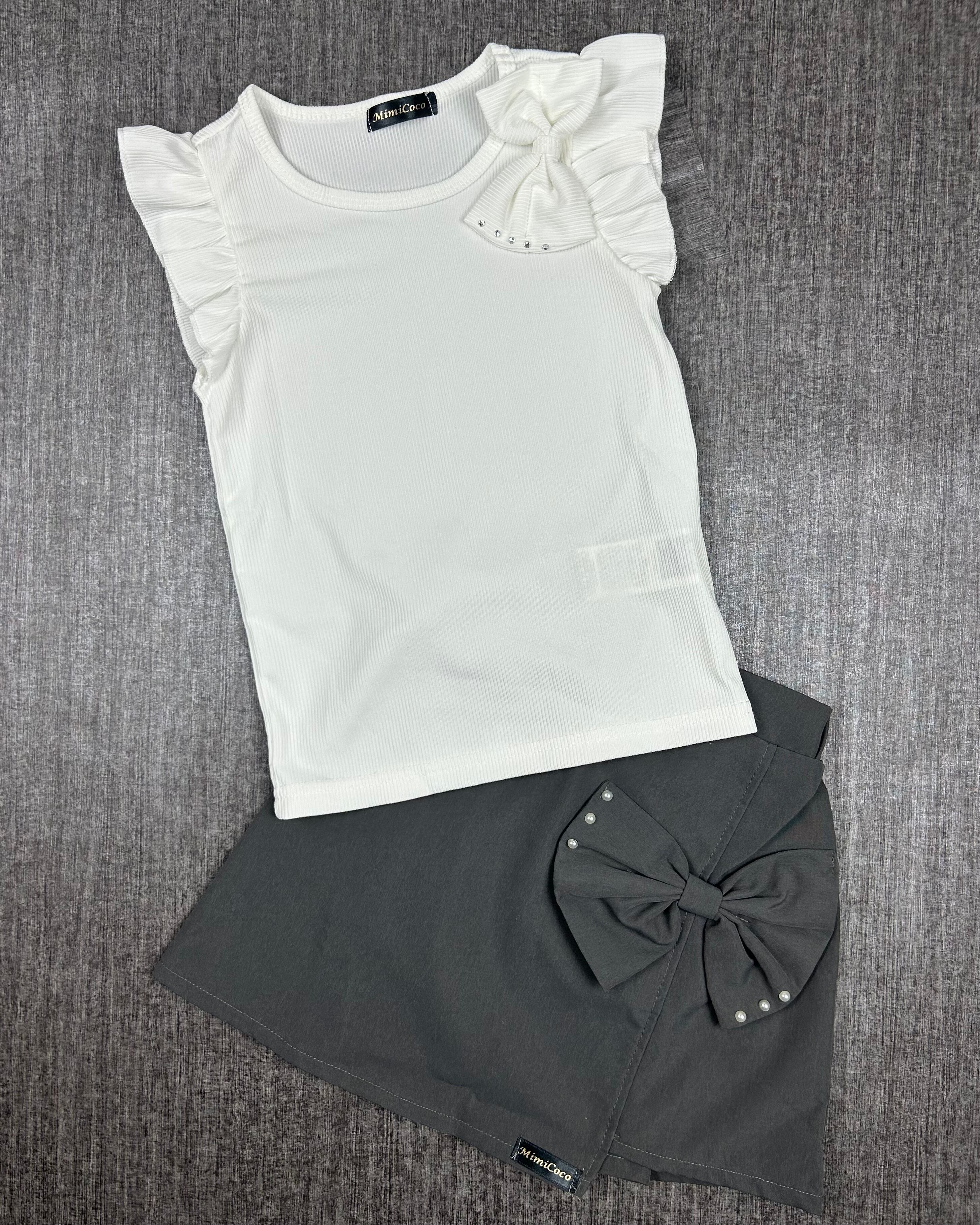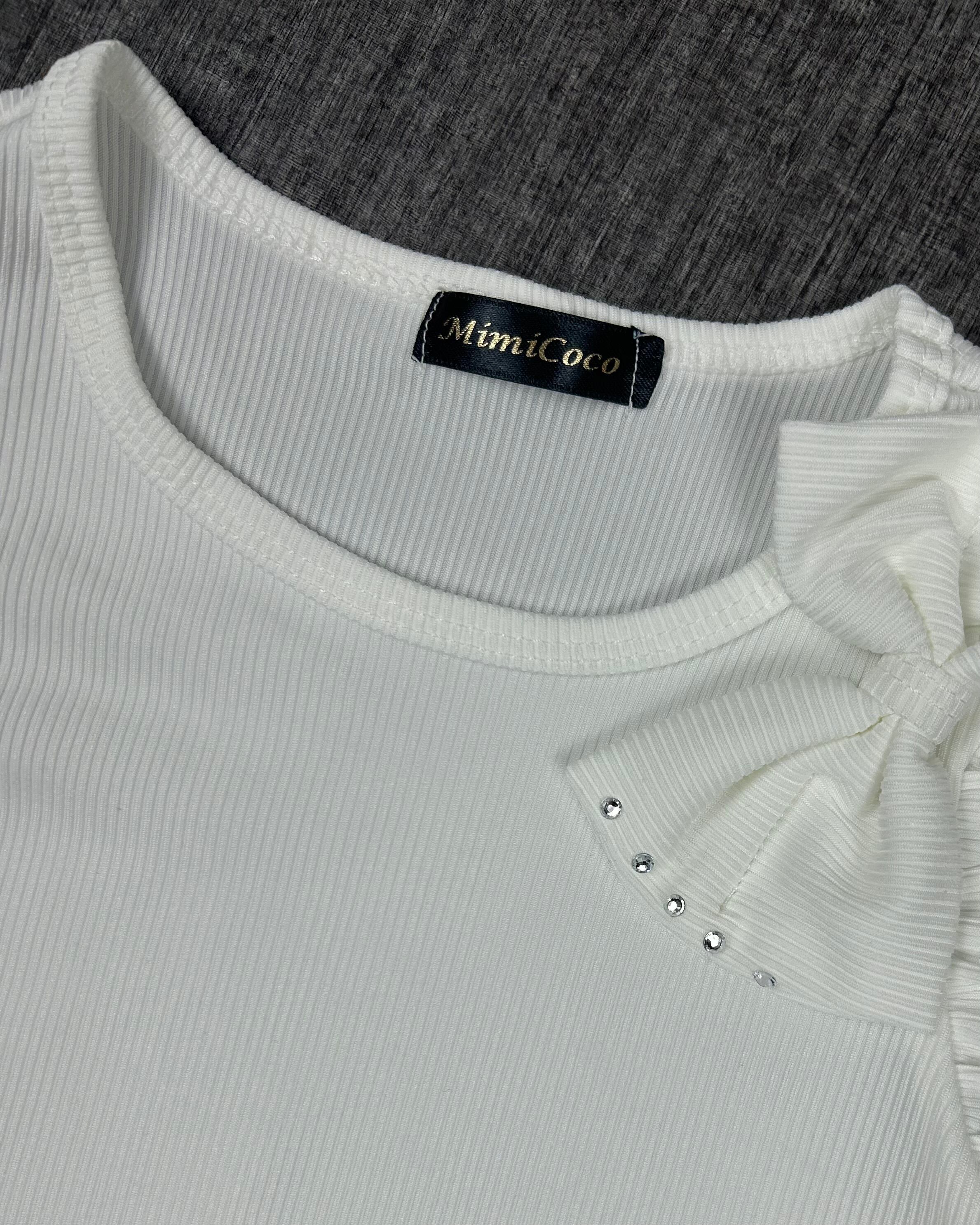 リボンと肩フリルが特徴のこのセットアップは、カジュアルなお出かけから特別なシーンまで幅広く活躍するアイテムです。柔らかいリブニット素材を使用しており、心地よい着心地を提供します。リボンが華やかさをプラスし、肩フリルが女の子らしさを引き立てる魅力的なデザインです。