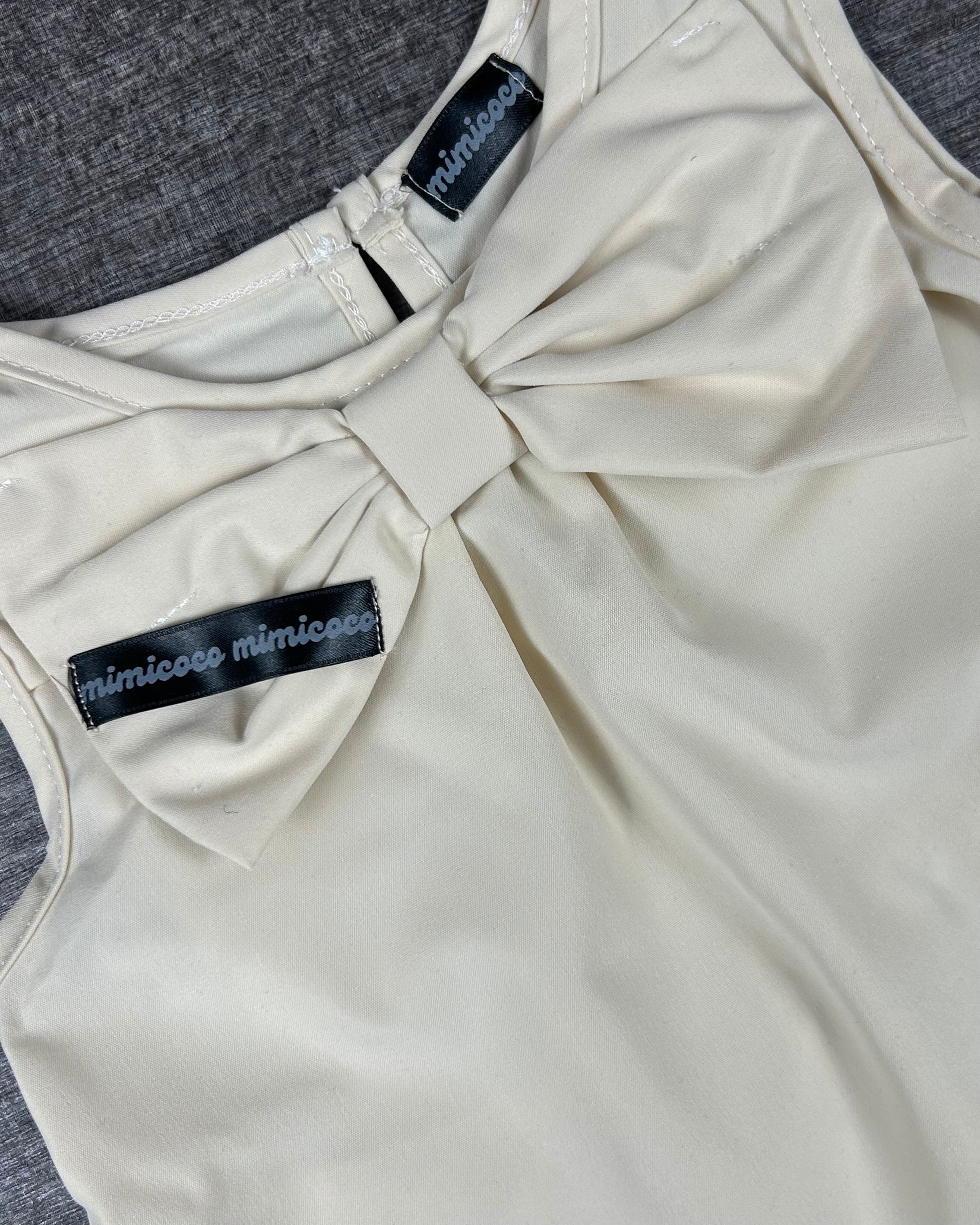 大き目のリボンが印象的なこのロンパースは、特別なお出かけから日常使いまで幅広く活躍する一着です。リボンにはMimiCocoのロゴがあしらわれており、シンプルながらも洗練されたデザインが赤ちゃんの可愛らしさを引き立てます。着脱も簡単な工夫が施されておりますので、ママも安心してご使用いただけます。