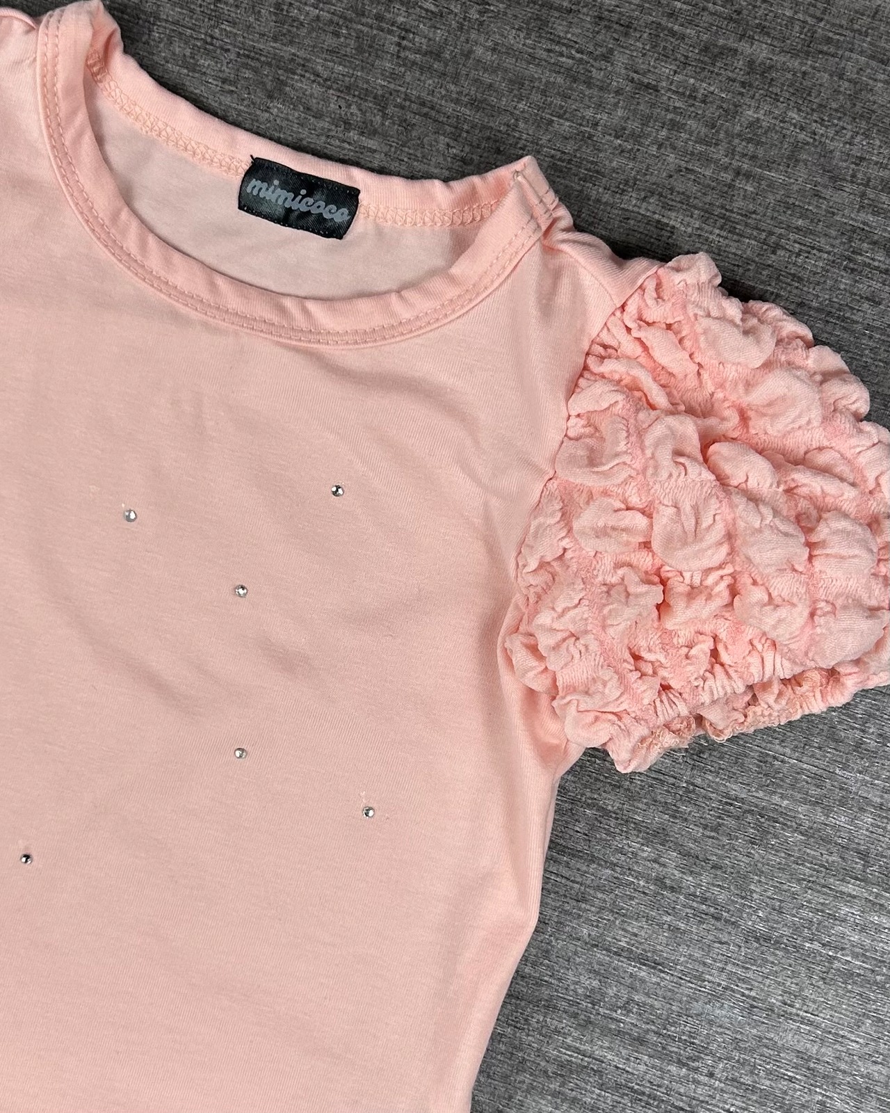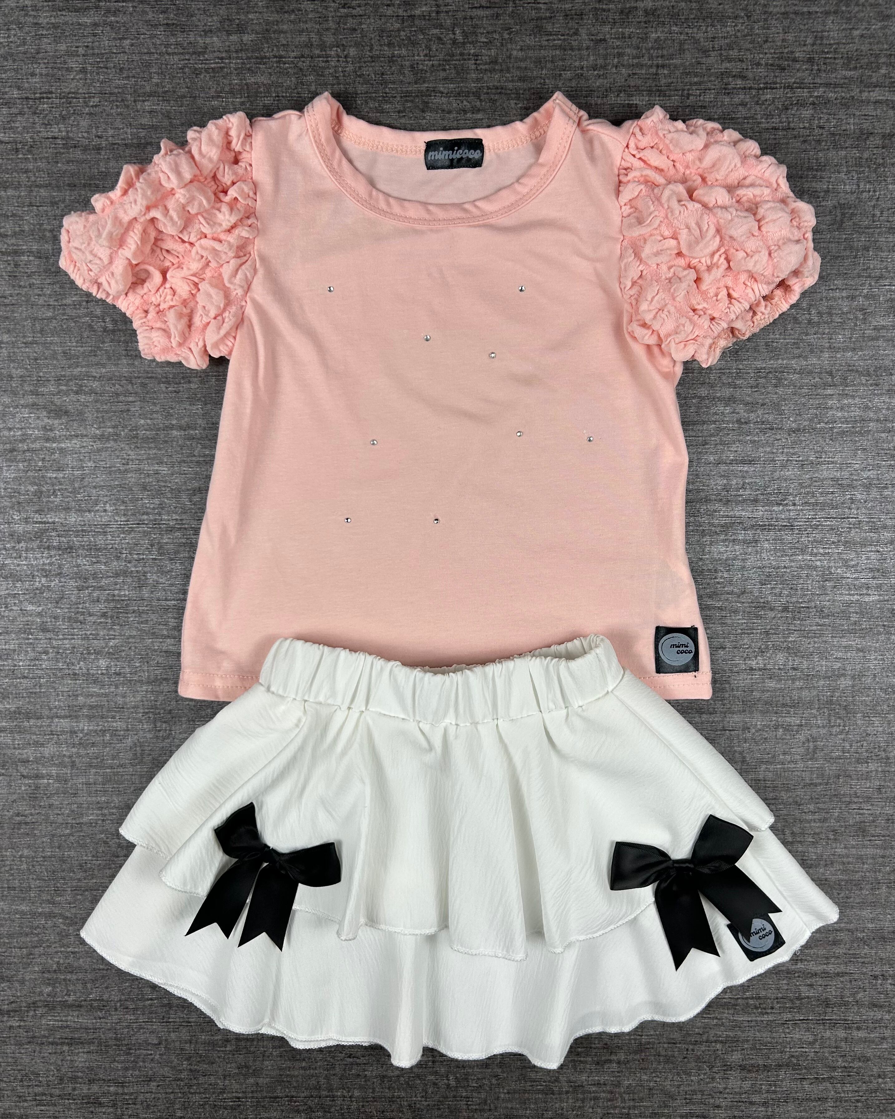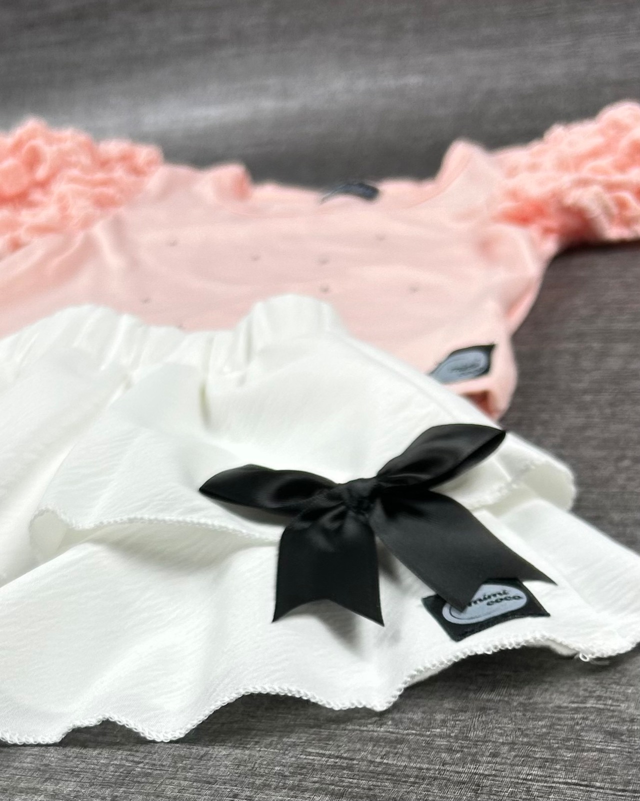 このセットアップは、袖部分に施された美しいフラワーチュールと、可愛らしいリボン付きスカートが特徴です。特別なお出かけや日常使いに最適で、華やかな印象を与えます。柔らかな素材が優しく肌に触れ、快適な着心地を実現しています。