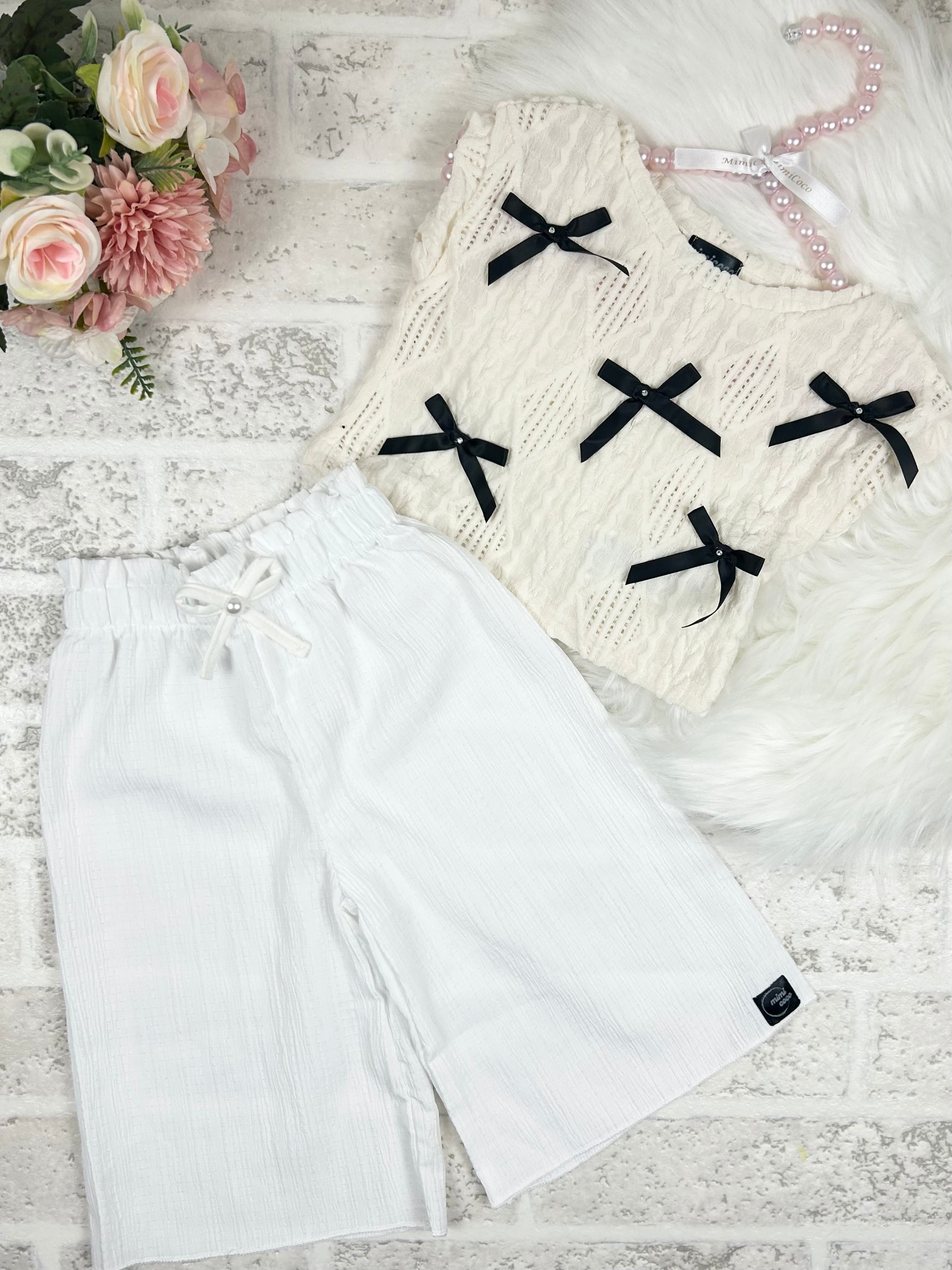 このセットアップは、トレンド感満載のリボンがデザインされたトップスと、快適さとスタイルを両立したワイドパンツが特徴です。日常使いや特別なお出かけにぴったりで、女性らしさを引き立てるアイテムです。サマーニット素材を使用しており、心地よい着心地を実現しています。