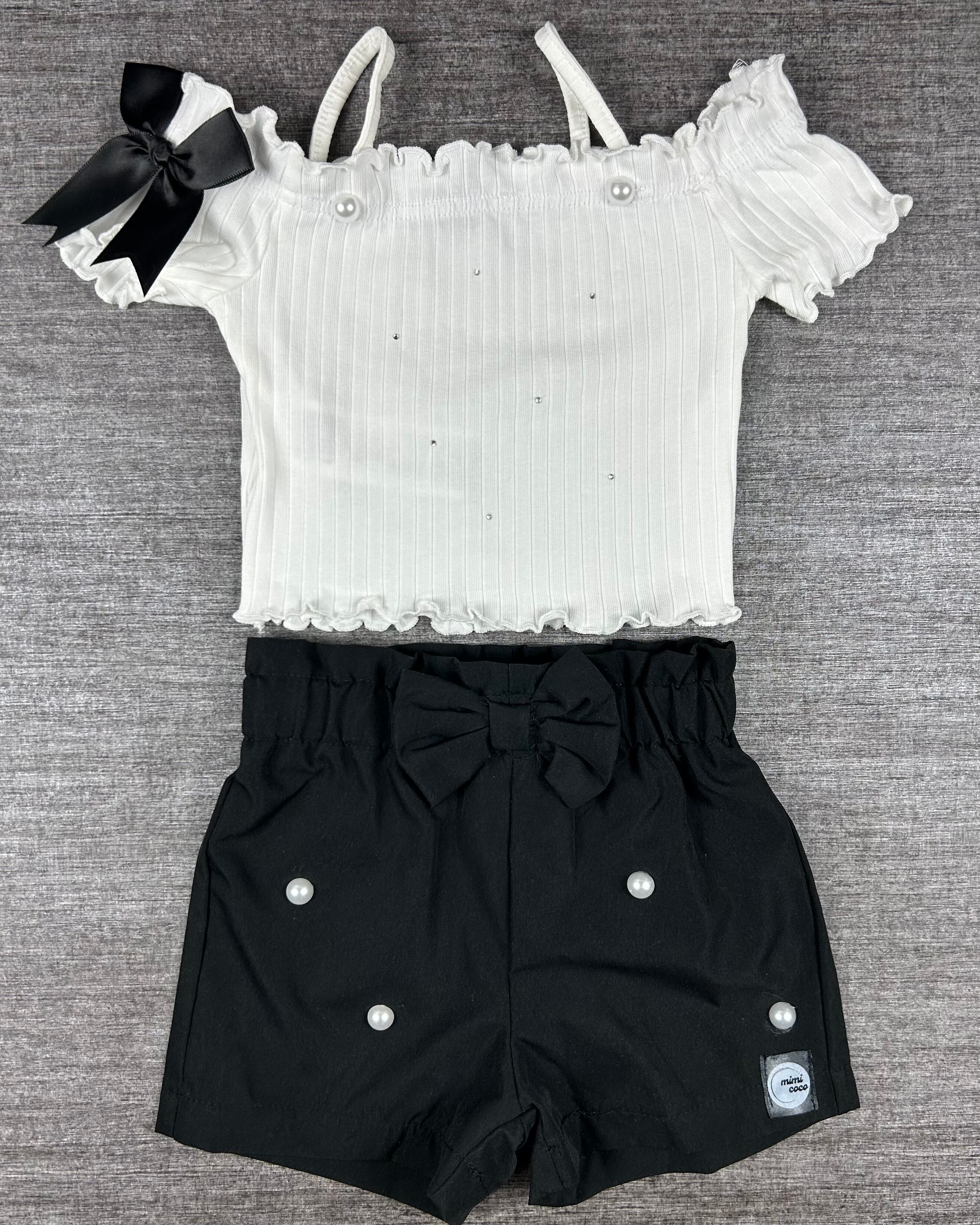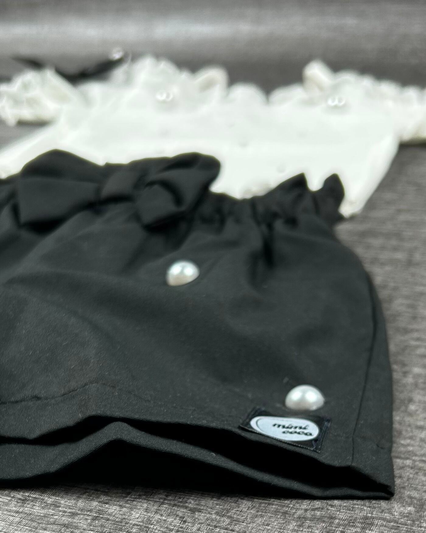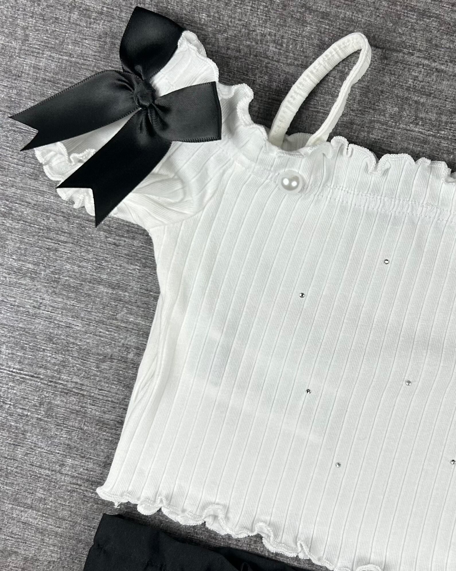 このセットアップは、リボンデザインのトップスにストーンが施され、かわいらしいリボン付きショートパンツが特徴です。特別なお出かけや日常使いにぴったりで、愛らしい印象を与えます。柔らかな素材が赤ちゃんの肌に優しく、安心してご着用いただけるアイテムです。