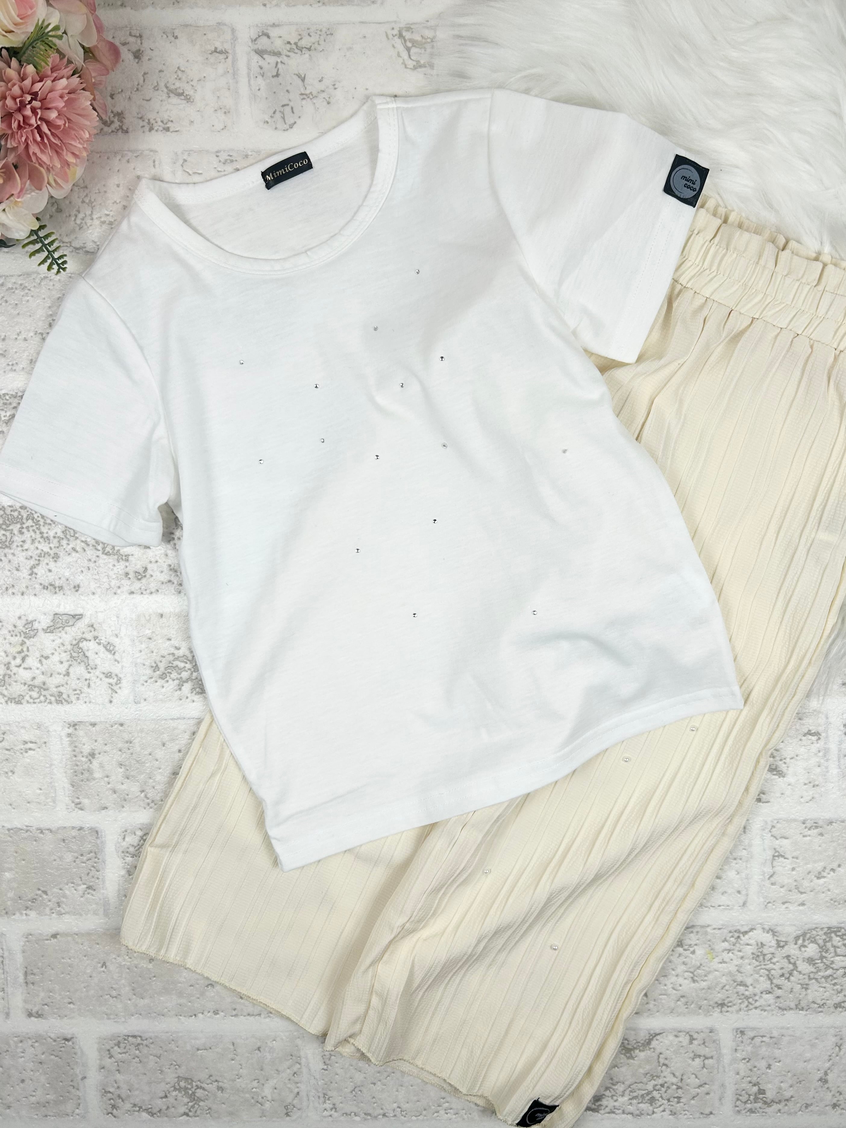 このセットアップは、ストーン付きのTシャツとゆったりとしたワイドパンツが特徴のアイテムです。日常使いやお出かけにぴったりで、カジュアルながらも洗練された姿を引き立てる一品です。軽やかな生地を使用しているため、動きやすく、快適な着心地を実現しています。